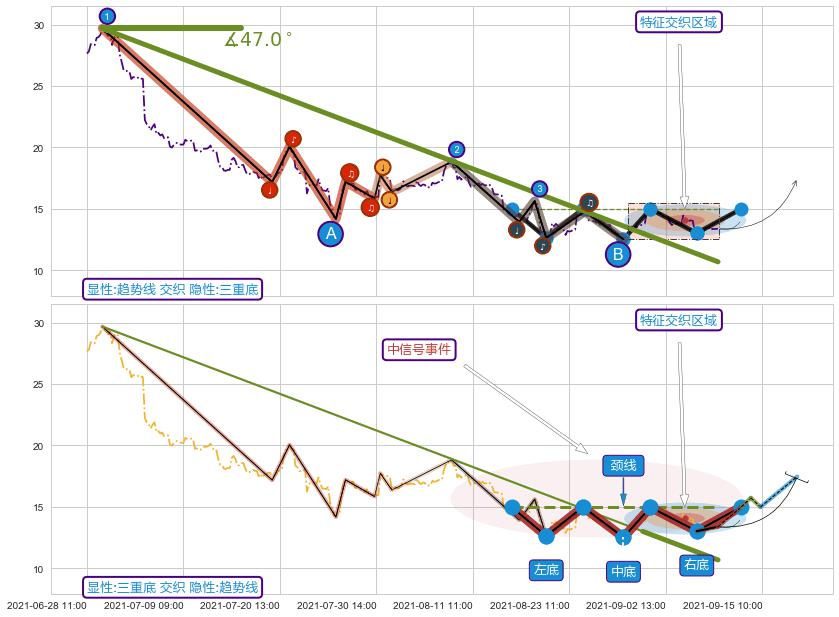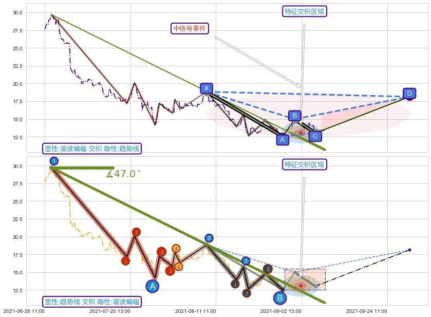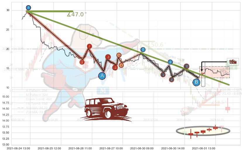 从2021-06-29 12:00至2021-08-31 13:00,共包含281个小时,阶段股价下跌-68.01%,阶段股价变动位移路程比: 1 : 6,下跌趋势角度: 47.0