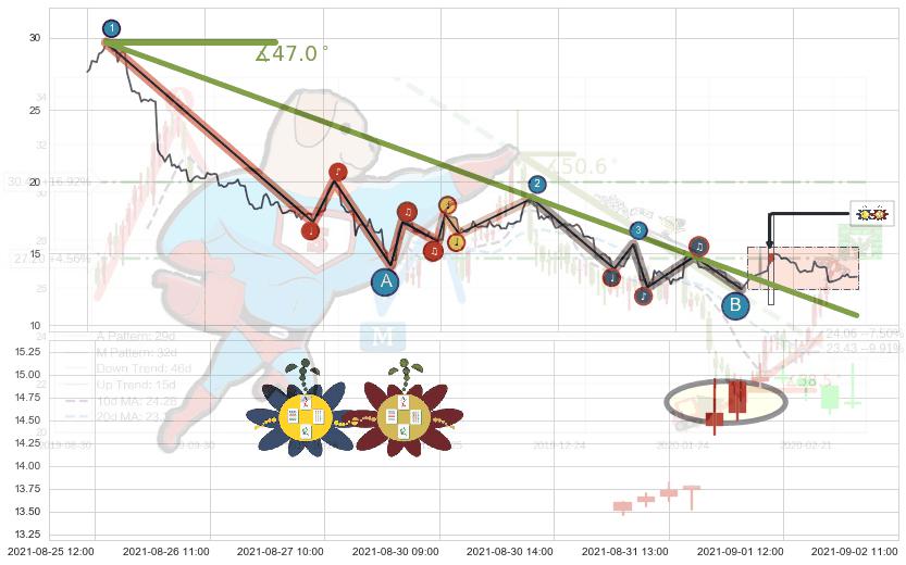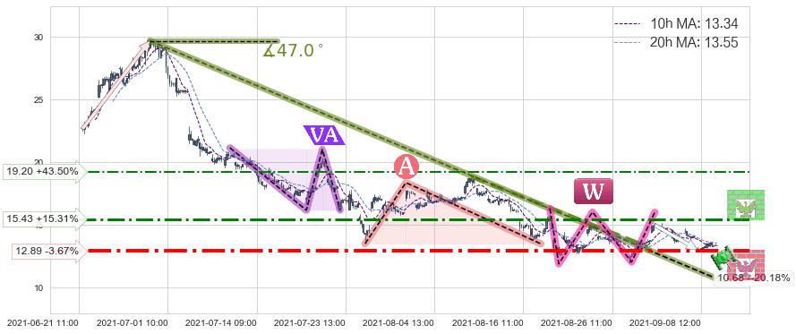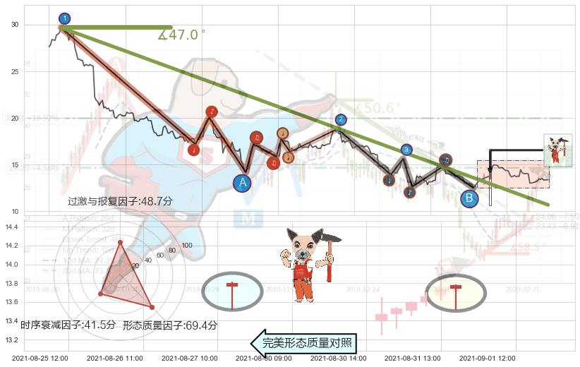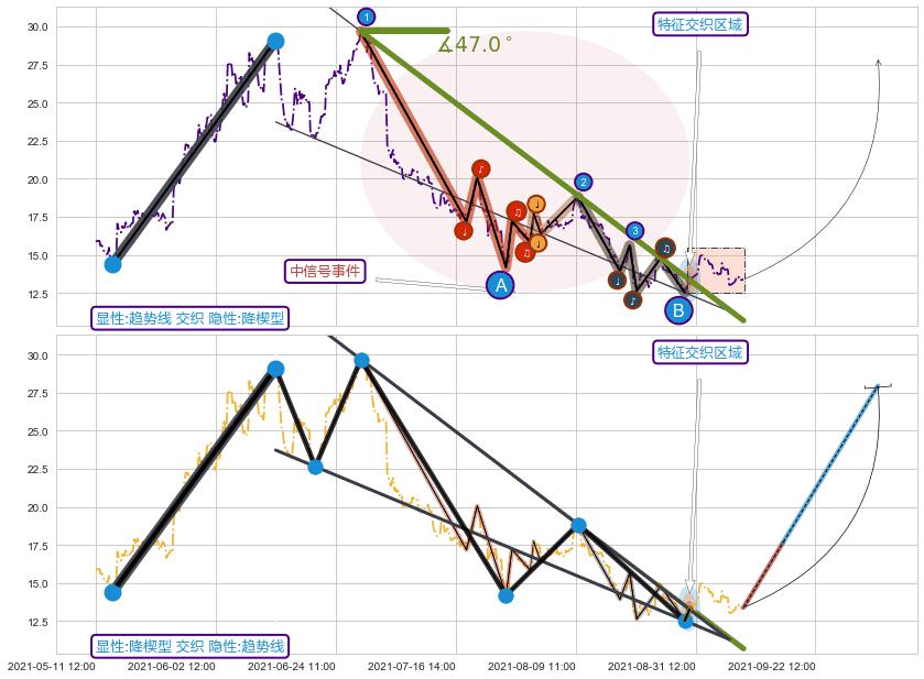 从2021-08-09 13:00至2021-08-31 13:00,共包含100个小时,阶段股价下跌-28.42%,阶段股价变动位移路程比: 1 : 5,下跌趋势角度: 48.5