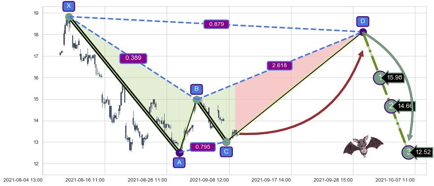 ➣ 谐波蝙蝠:b下跌接近c:猜想支撑性拉升 → 上涨 →【拐点】支撑临近 → 大趋势均值回复