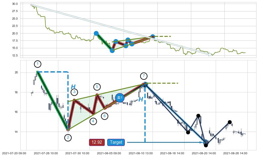 ➢ 最小中继整理跌幅→𝐇: 5.87 (𝐇楔型旗杆的长度:楔型起点→顶点)