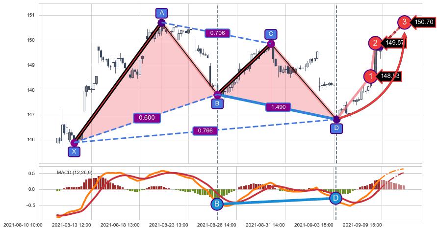 ➢ 谐波价格D点比B点低 ⤵,【MACD】指标D点比B点高 ⤴️