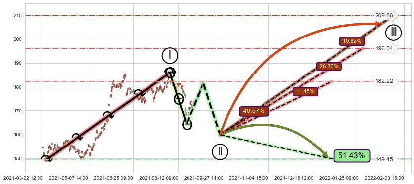➣ 高概率大级别循环上涨浪被破坏,反转向下(突破5浪起点)概率51.43%