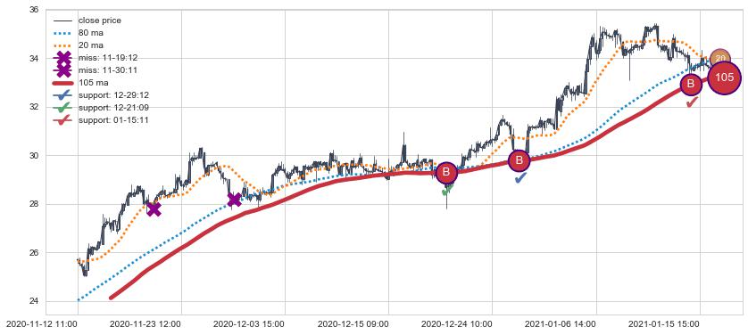 ➢ 最优均线组合共正确确认支撑阻力信号10处,正确确认率 71.43%