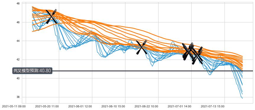 ➣ 21小时均线于(07-02 15:00: 42.53)形成【死叉】基于【死叉历史模型】预测死叉后最低波谷价格: 40.89, 死叉后最低价格37.64,已经下跌超出预测最低波谷价格, 预期反弹