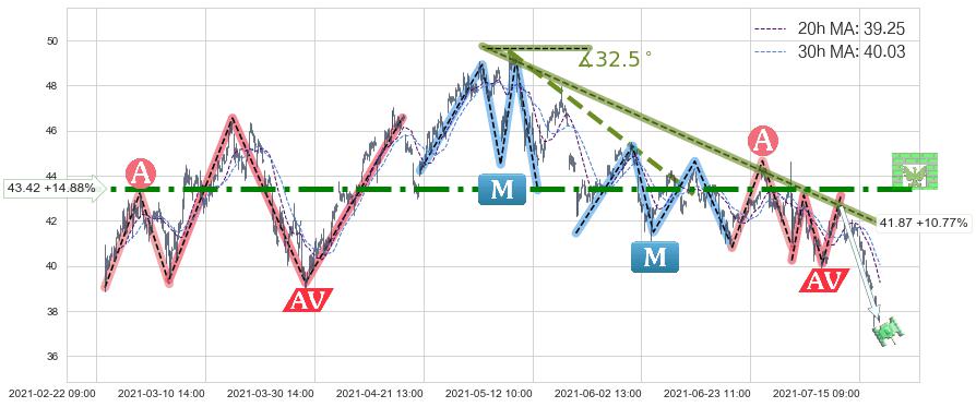 2021-06-25: 第一阻力位43.42起到了持续的阻力作用,有效地促进了价格的回落。
