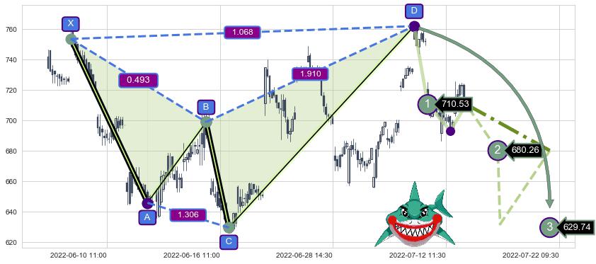 ➣ 谐波鲨鱼:已到达d点:猜想c拉升到达d点后泄力性下沉下跌(均值回复)