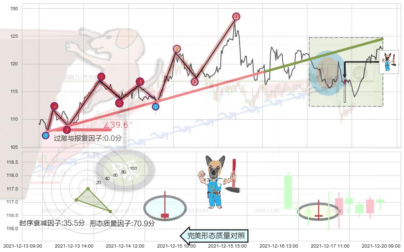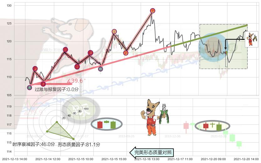 ➣ 2021-10-06 11:00-2021-11-30 10:00上升趋势存在反转[风险],虽然原上升趋势的支撑位(124.45)已破位,但其支撑效果尚存,原上升趋势角度: 39.6˚