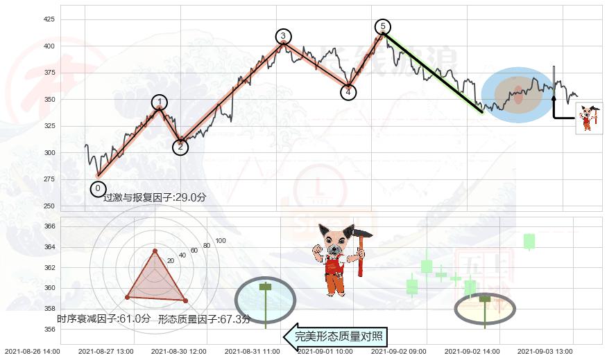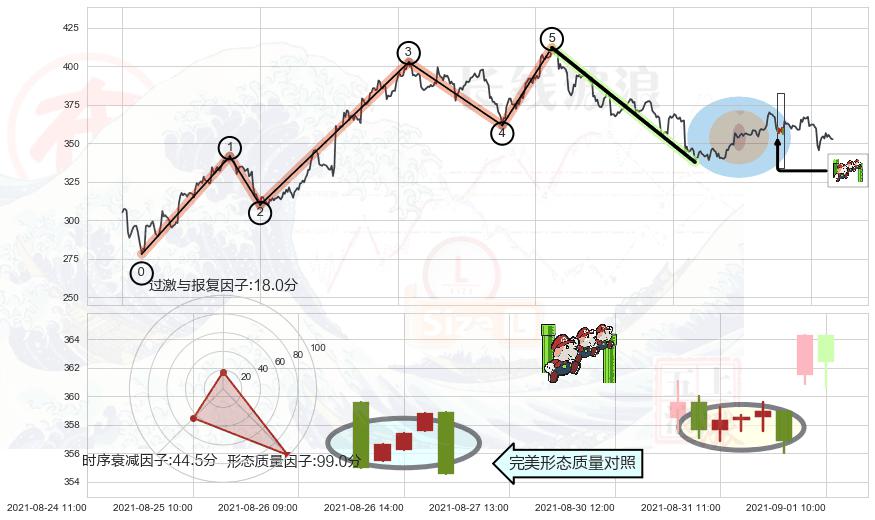 ➢ 🕰 价格走势在2021-09-01 12:00:00至2021-09-02 10:00:00期间形成高档五阴线,残存影响值:-1.72