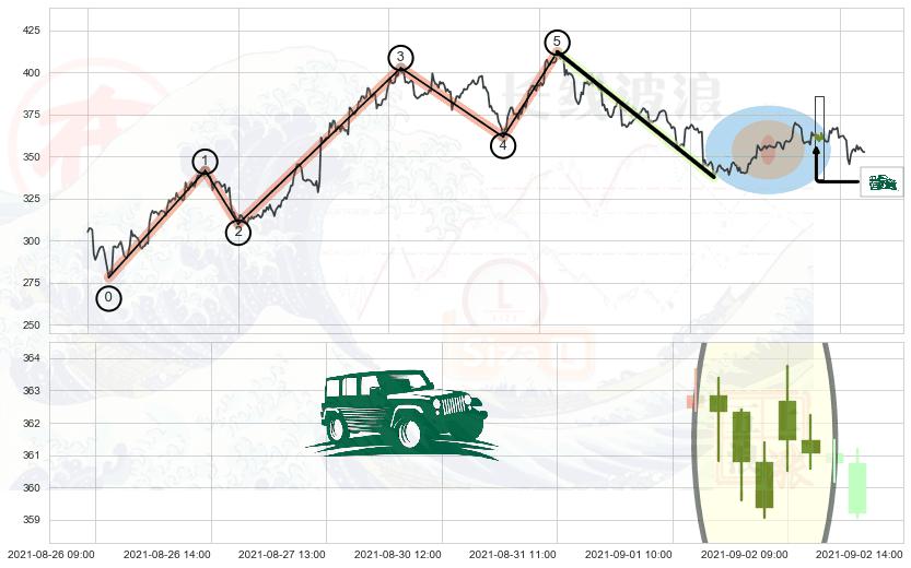 ➢ 收盘价(08-31:10: 357.63 )→回踩→第一根k线高点(08-27:14: 361.29 )
