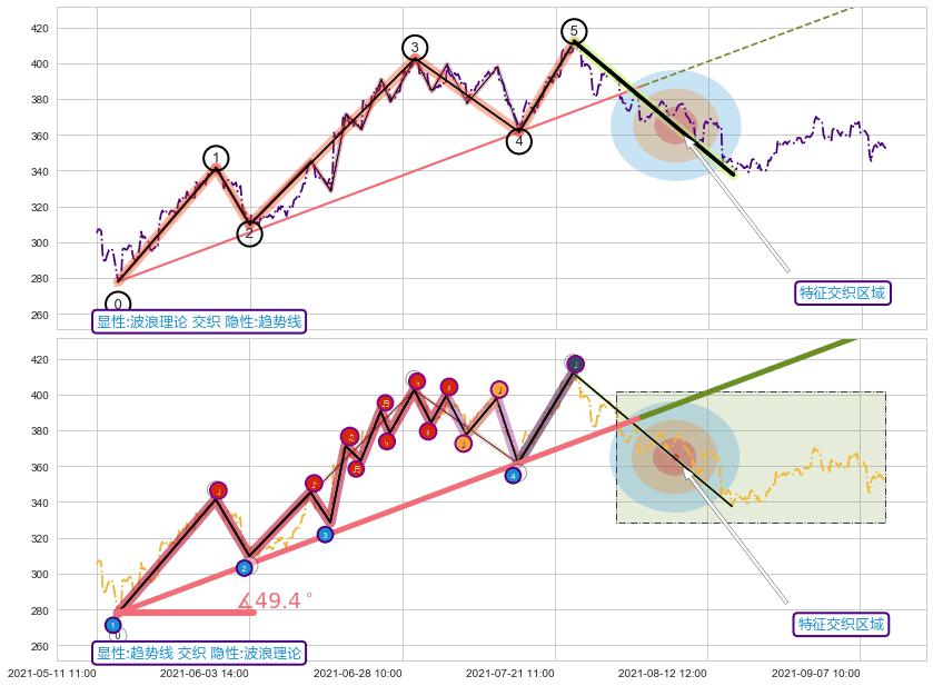 ➢ 【仅预测突破】最后价格:352.59与预测突破价格:374.21→【空间较大】后续最小【整理】第一目标价格→(10-05:11: 448.23 )