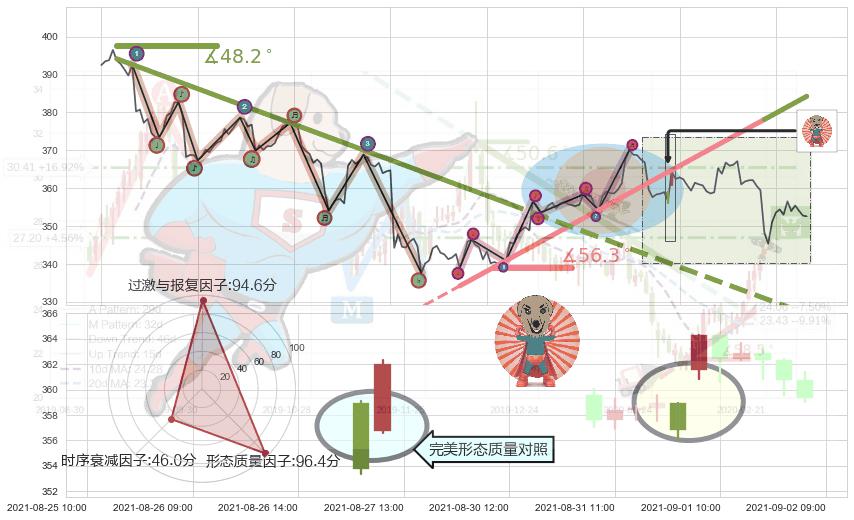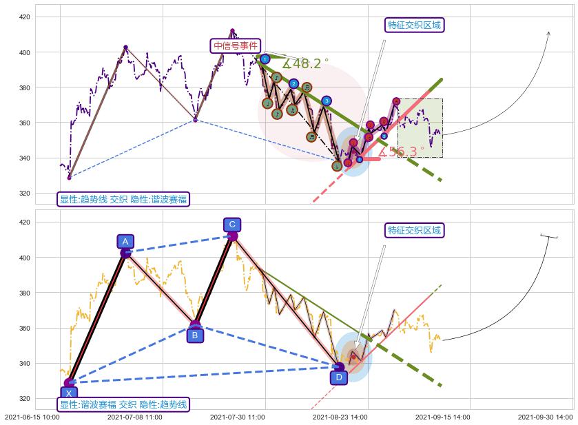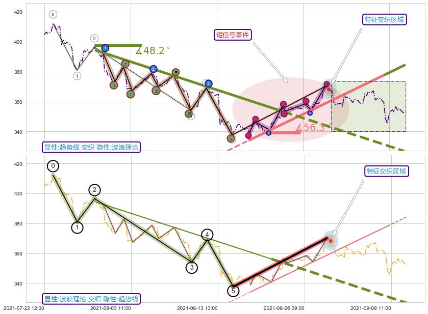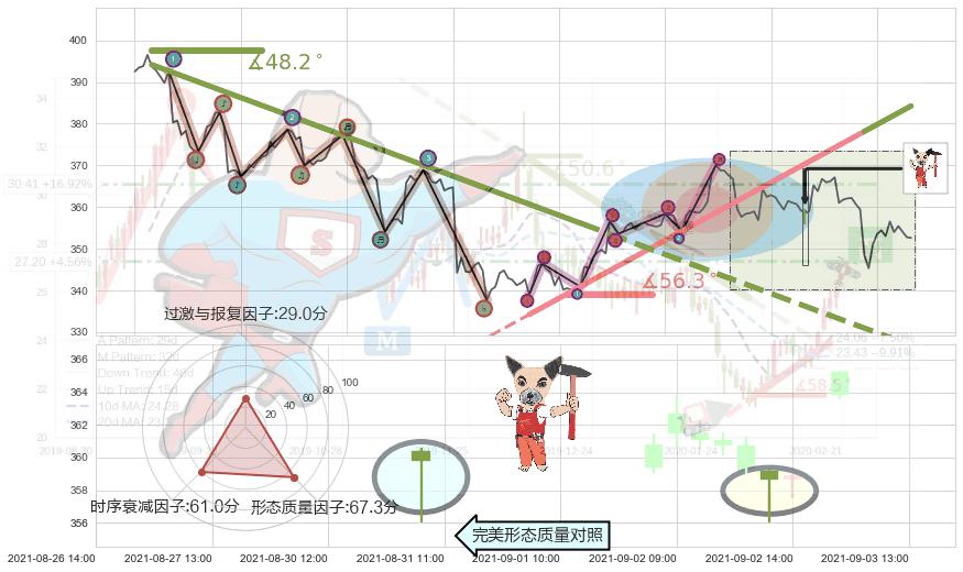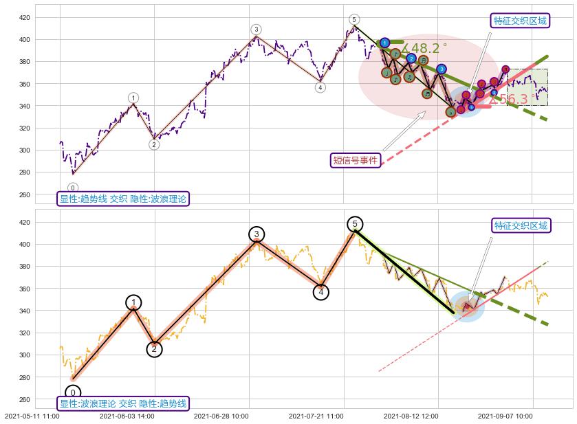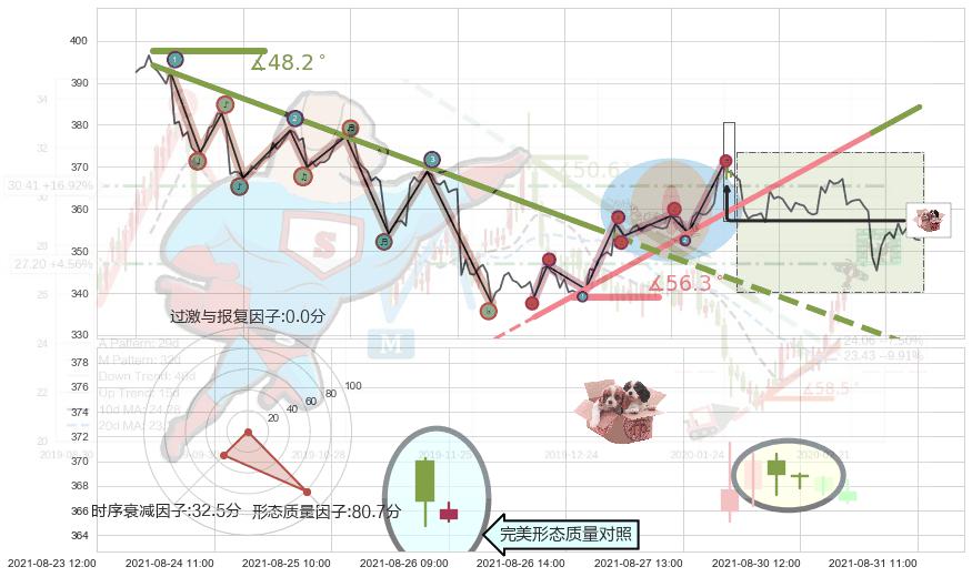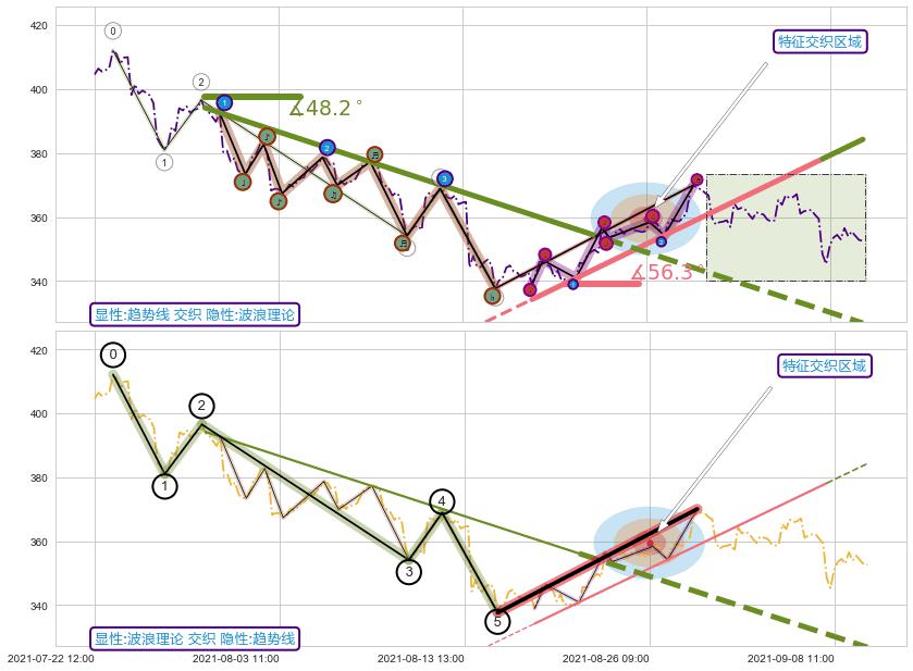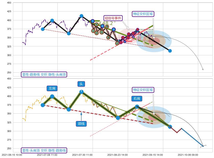 ➢ 2021-07-29 10:00-2021-08-20 14:00下跌趋势存在反转上涨[机会],其原下跌趋势的阻力位(326.83)已被突破[强支撑信号],原下跌趋势角度: 48.2˚