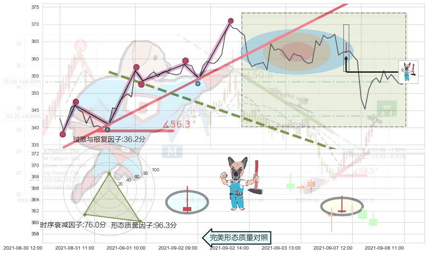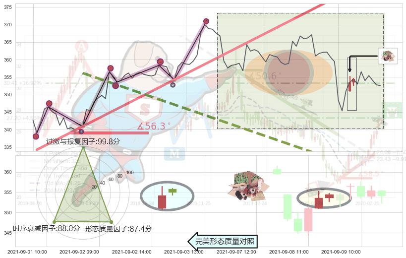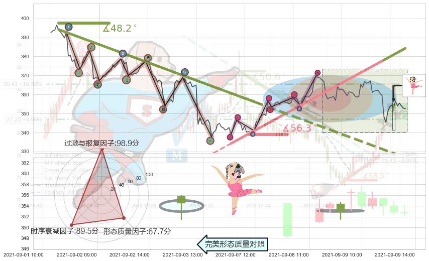 ➣ 2021-08-18 14:00-2021-09-08 09:00上升趋势存在反转[风险],其原上升趋势的支撑位(384.26)已破位[强阻力信号],原上升趋势角度: 56.3˚