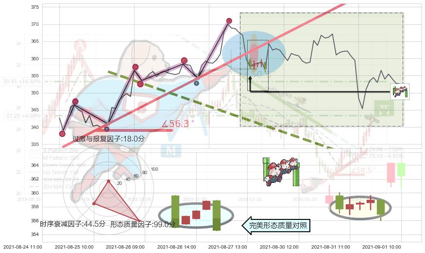 从2021-08-18 14:00至2021-09-08 09:00,共包含80个小时,阶段股价上涨2.97%,阶段股价变动位移路程比: 1 : 13,上涨趋势角度: 56.3
