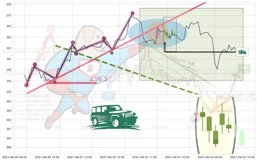 ➣ 2021-07-29 10:00-2021-08-20 14:00下跌趋势存在反转上涨[机会],其原下跌趋势的阻力位(326.83)已被突破[强支撑信号],原下跌趋势角度: 48.2˚