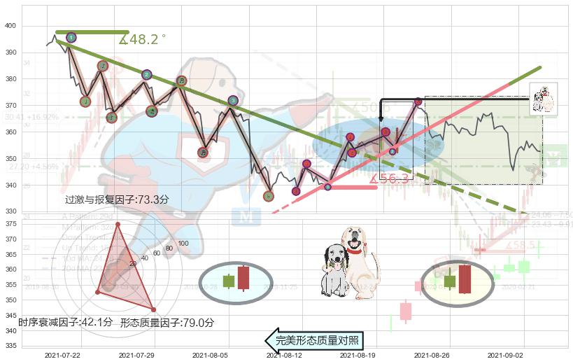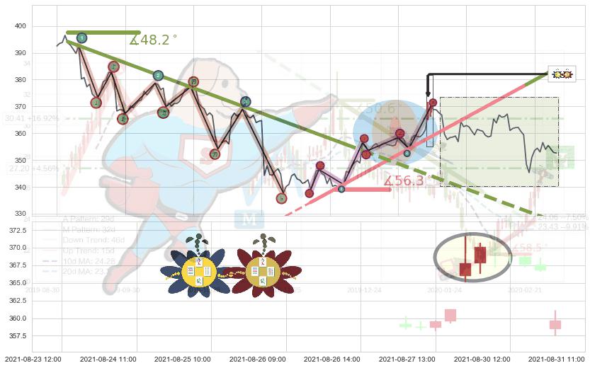 ⚔️ 2021-07-29 10:00-2021-08-20 14:00下跌趋势存在反转上涨[机会],其原下跌趋势的阻力位(326.83)已被突破[强支撑信号],原下跌趋势角度: 48.2˚