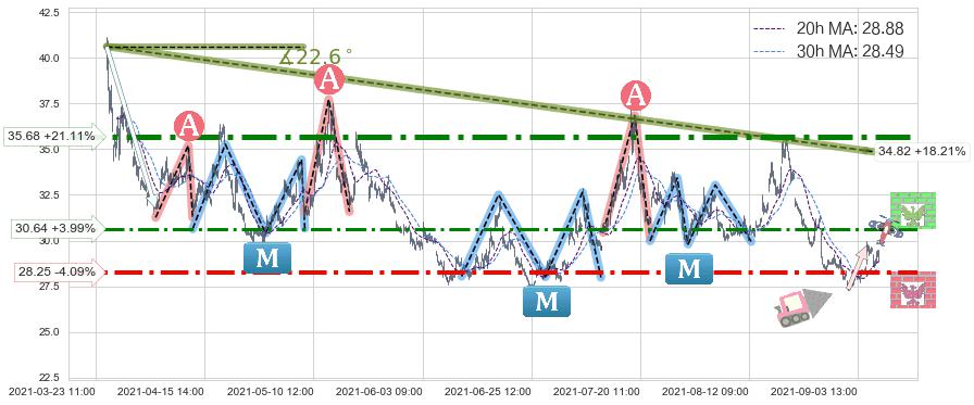 ♘ 阻力价格位30.64,可信任强度68.22%,距离最后交易2021-09-09 14:00形成的收盘价格29.46相差 +3.99%