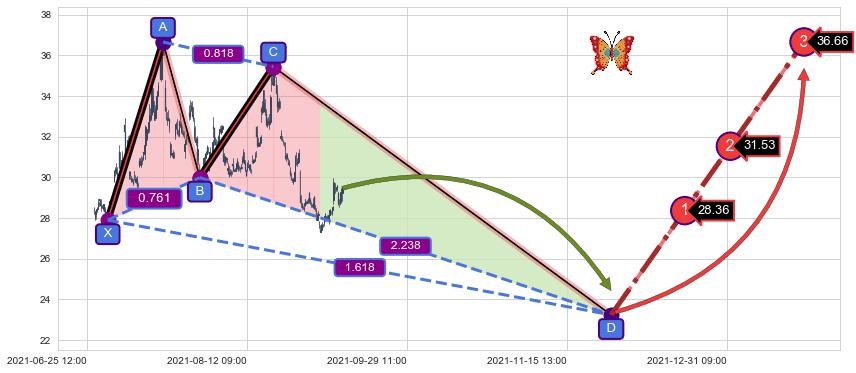 ➢ 距离预测D点位置有足够的下跌空间, 与看涨【蝴蝶】形态相反,实际方向【看跌】