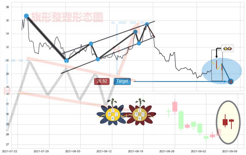 ➣ 升旗形:猜想预期下跌目标target即将达成,随后猜想强支撑来临,预期反弹上涨(均值回复)