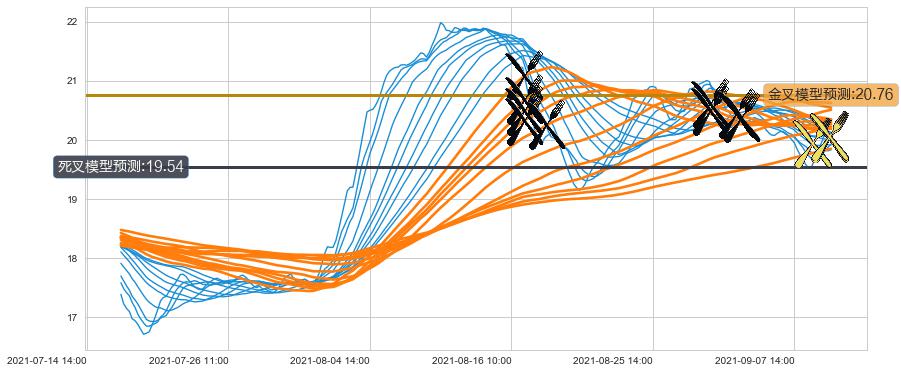 ➢ 70小时均线于(08-16 14:00: 21.06)形成【死叉】基于【死叉历史模型】预测死叉后最低波谷价格: 20.21, 死叉后最低价格19.05,已经下跌超出预测最低波谷价格, 预期反弹