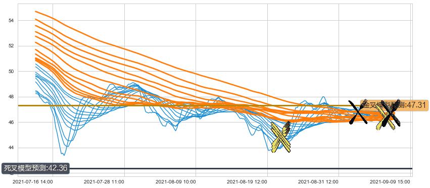➢ 70小时均线于(09-09 12:00: 46.76)形成【死叉】基于【死叉历史模型】预测死叉后最低波谷价格: 42.52, 死叉后最低价格46.46,尚未达到预测最低波谷价格, 预期继续下跌