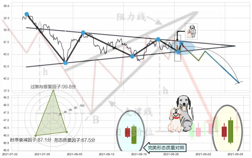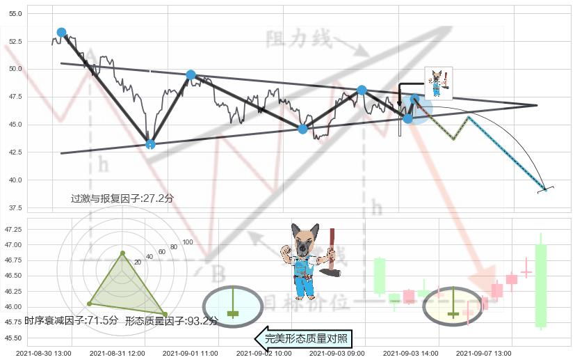 ➢ 下跌镊子线(n形磁铁) 🔜 下降对称三角整理临近支撑猜想转换阻力下跌 综合量化分数:43.86 【偏空】