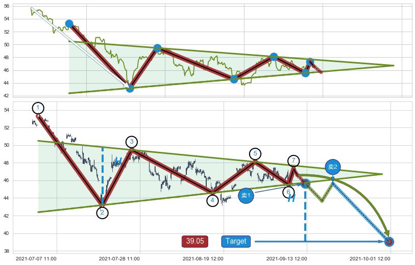 ➣ 下降对称三角整理:猜想临近关键支撑位突破点 → 临近拐点下跌 → 风险信号 → 大趋势均值回复