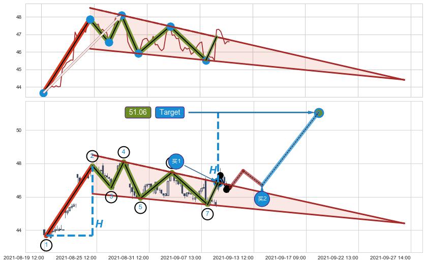 ➢ 最小中继整理跌幅→𝐇: 6.59 (低点逐步抬高斜边第一支撑点②与阻力边垂直距离)