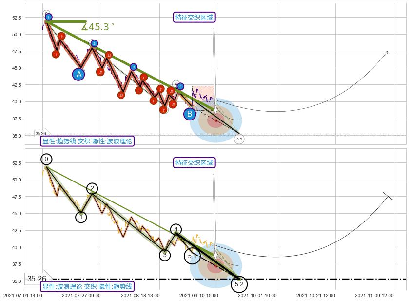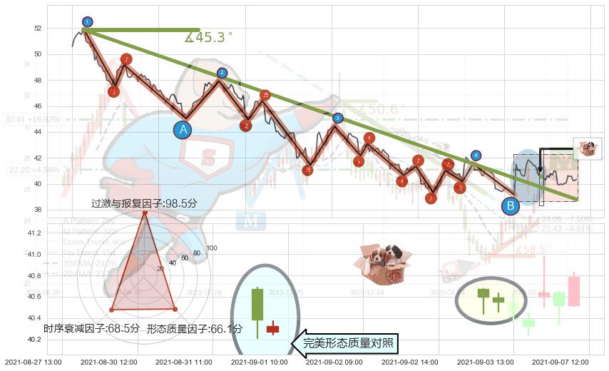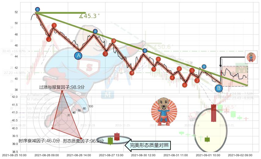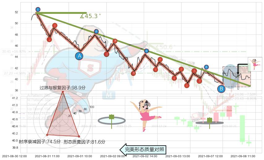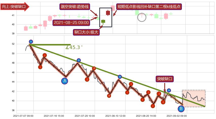 ➢ 2021-07-06 09:00-2021-09-02 09:00下跌趋势存在反转上涨[机会],其原下跌趋势的阻力位(38.80)已被突破[强支撑信号],原下跌趋势角度: 45.3˚