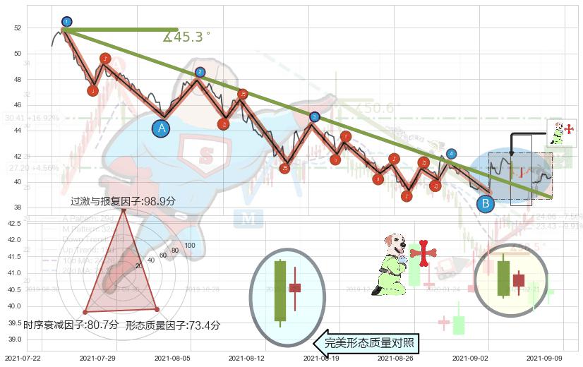 从2021-07-06 09:00至2021-09-02 09:00,共包含257个小时,阶段股价下跌-21.05%,阶段股价变动位移路程比: 1 : 7,下跌趋势角度: 45.3