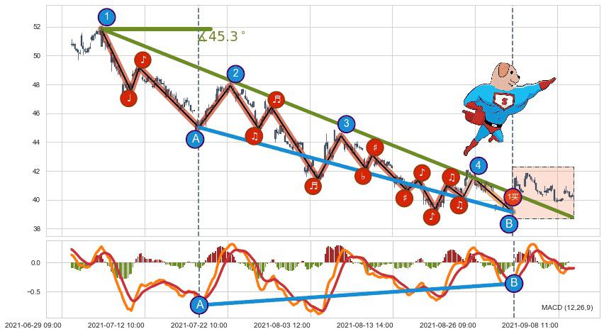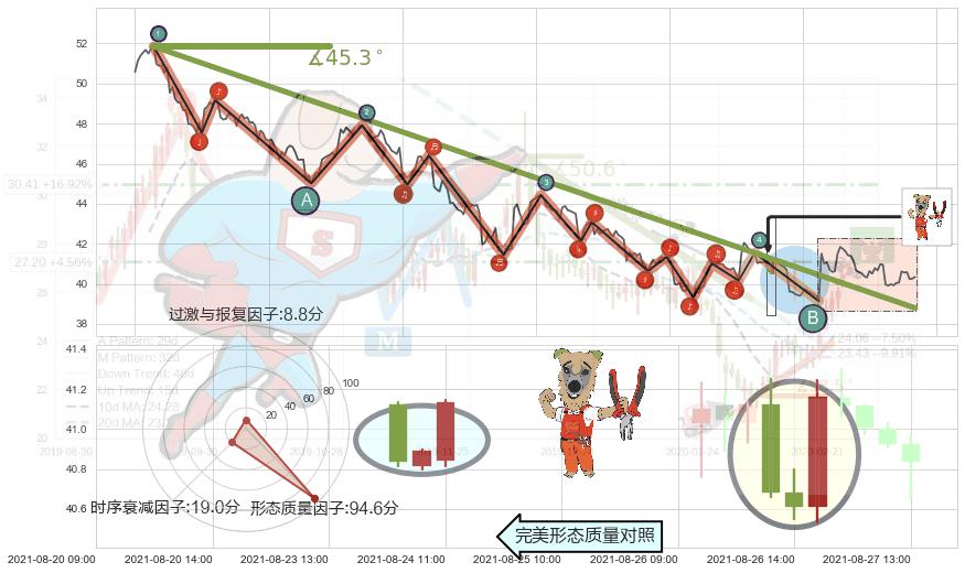 从2021-07-06 09:00至2021-08-25 09:00,共包含221个小时,阶段股价下跌-21.34%,阶段股价变动位移路程比: 1 : 6,下跌趋势角度: 50.0