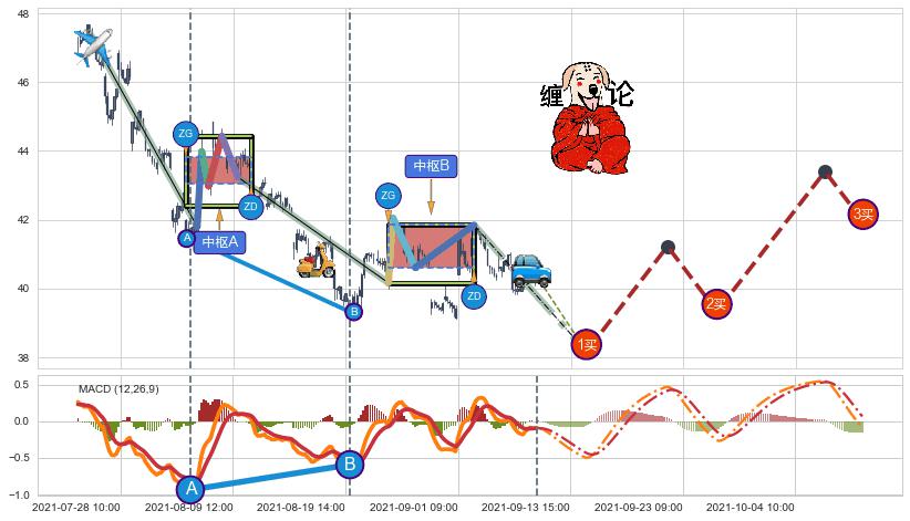 ➣ 缠论中枢点:猜想即将止跌 → 上涨 →【拐点】1买临近 → 大趋势均值回复