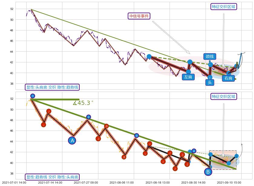 ➢ 2021-07-06 09:00-2021-09-02 09:00下跌趋势存在反转上涨[机会],其原下跌趋势的阻力位(38.80)已被突破[强支撑信号],原下跌趋势角度: 45.3˚