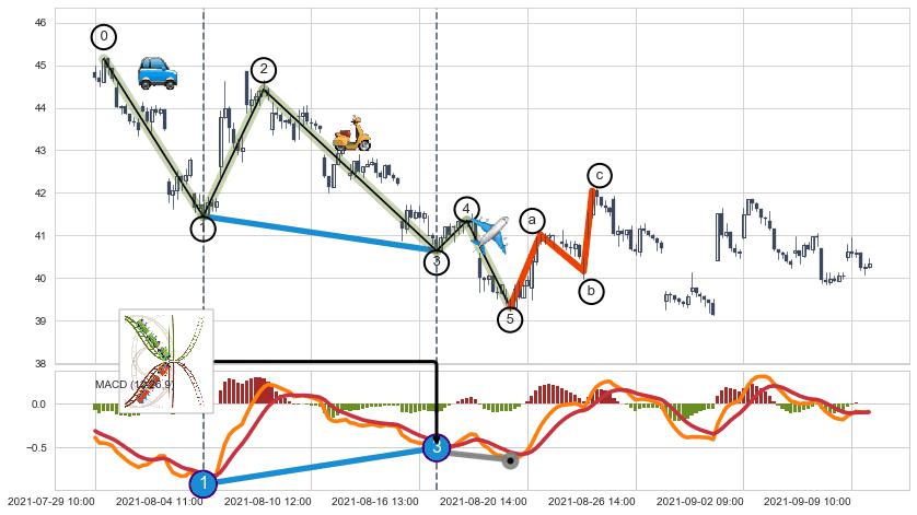 ➣ 波浪理论:猜想达到c点后小反弹终止反转下跌 → 下跌 → 【拐点】临近 → 阶段均值回复结束后继续大周期趋势跟踪