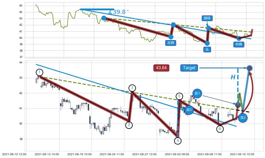 从2021-08-06 13:00至2021-08-31 14:00,共包含105个小时,阶段股价下跌-12.32%,阶段股价变动位移路程比: 1 : 4,下跌趋势角度: 39.8