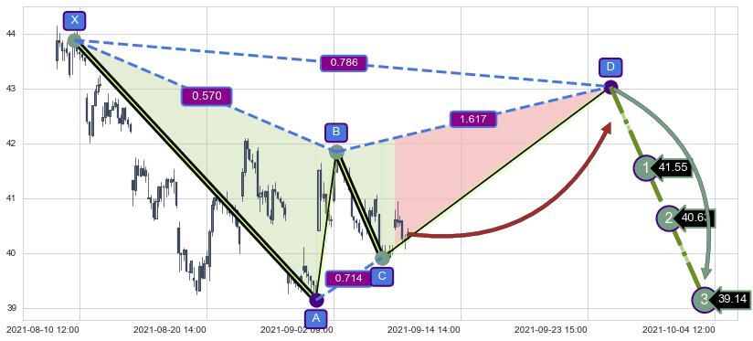 ➣ 谐波伽利:b下跌接近c:猜想支撑性拉升 → 上涨 →【拐点】支撑临近 → 大趋势均值回复