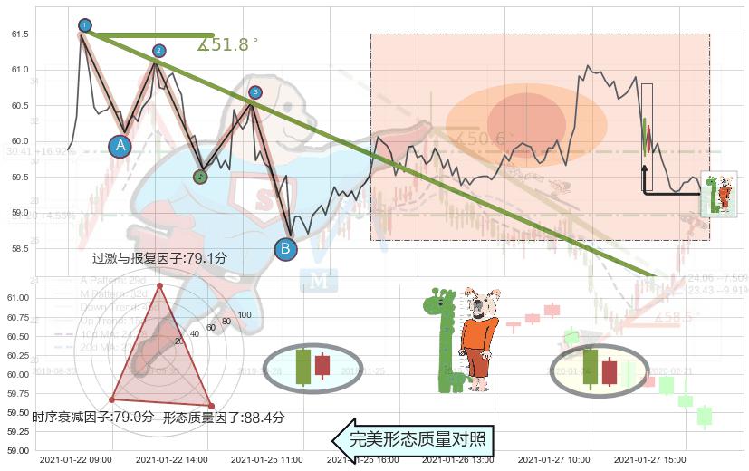 从2021-01-19 16:00至2021-01-28 16:00,共包含57个小时,阶段股价下跌-0.49%,阶段股价变动位移路程比: 1 : 25