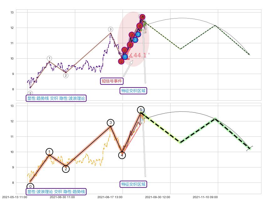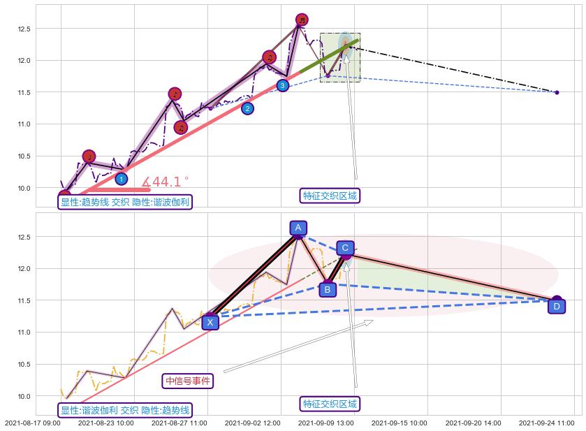 ➢ 2021-08-17 11:00-2021-09-03 13:00上升趋势存在反转[风险],虽然原上升趋势的支撑位(12.31)已破位,但其支撑效果尚存,原上升趋势角度: 44.1˚