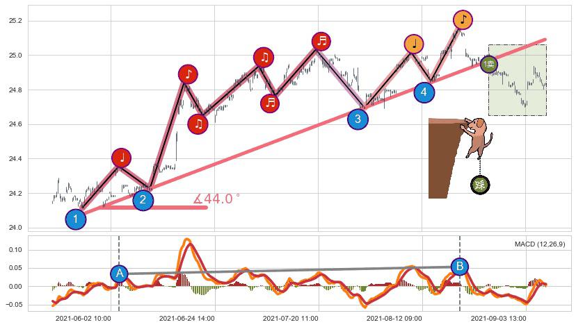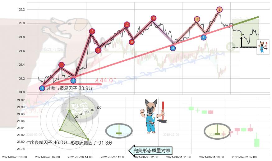 从2021-05-25 13:00至2021-08-27 10:00,共包含395个小时,阶段股价上涨3.25%,阶段股价变动位移路程比: 1 : 8,上涨趋势角度: 44.0