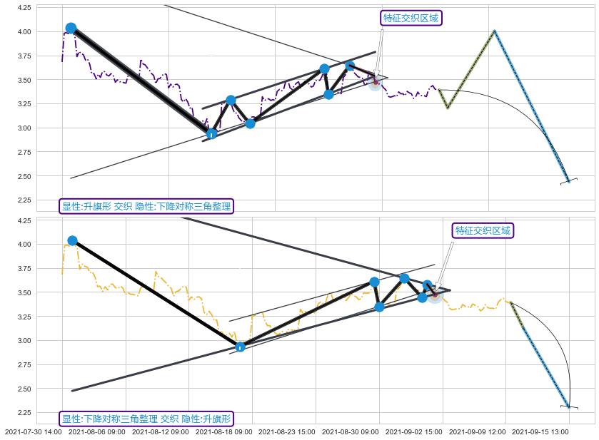 ➢ 升旗形与下降对称三角整理信号事件周期长度级别相同,同周期信号事件