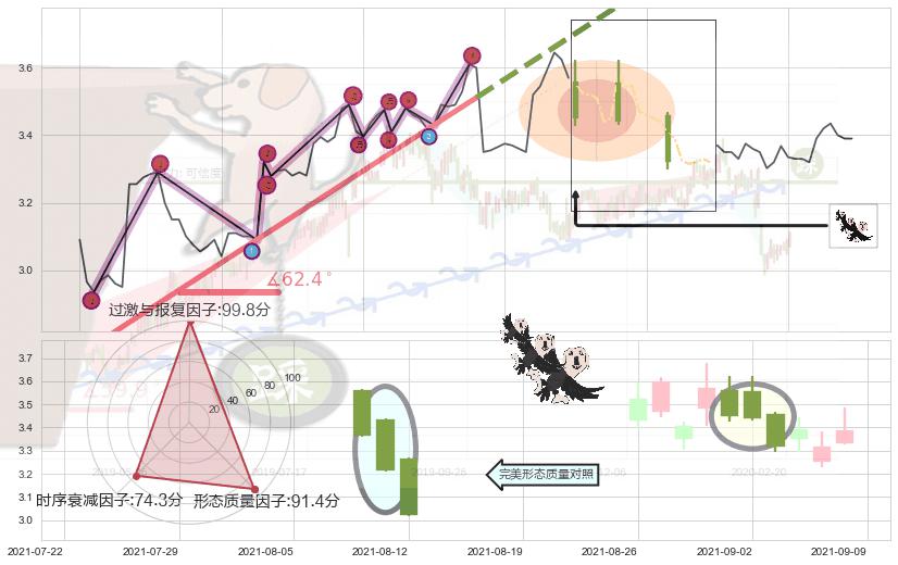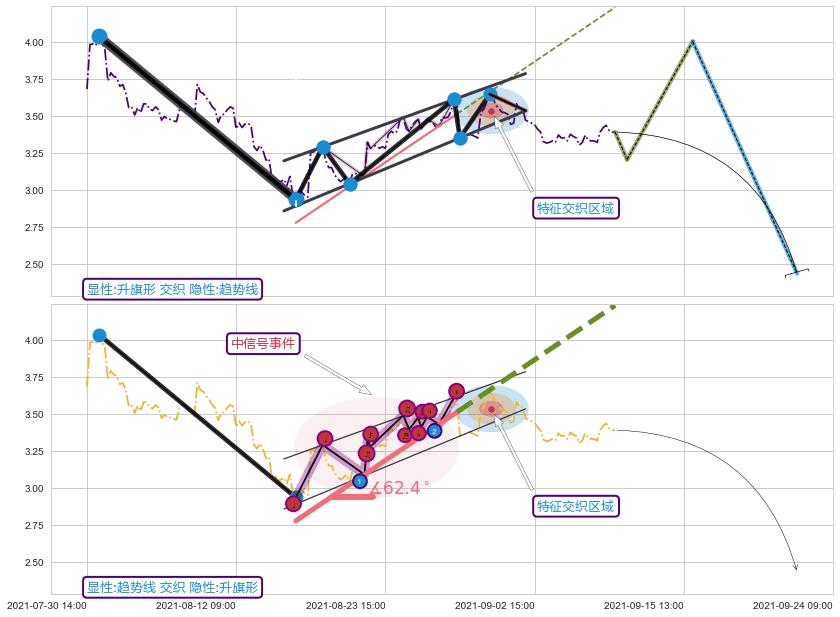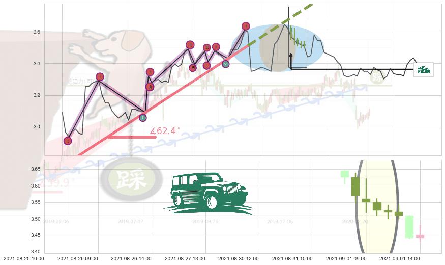 ➢ 2021-08-17 11:00-2021-08-27 14:00上升趋势存在反转[风险],其原上升趋势的支撑位(4.23)已破位[强阻力信号],原上升趋势角度: 62.4˚