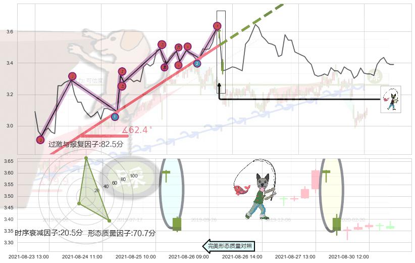 从2021-08-02 12:00至2021-08-20 11:00,共包含86个小时,阶段股价下跌-24.39%,阶段股价变动位移路程比: 1 : 4,下跌趋势角度: 55.3