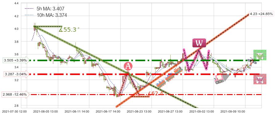 ♘ 阻力价格位3.505,可信任强度87.30%,距离最后交易2021-09-09 14:00形成的收盘价格3.390相差 +3.39%
