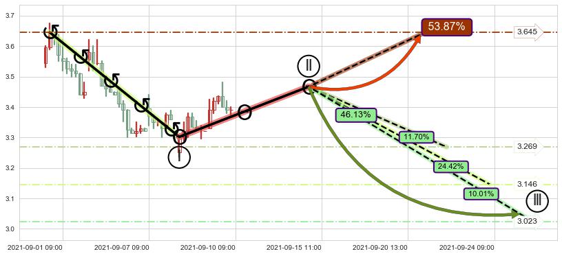 ➢ 循环浪继续向下【最高】位置(09-22:10, 3.269),匹配聚类样本比例25.35%, 可能性概率11.70%