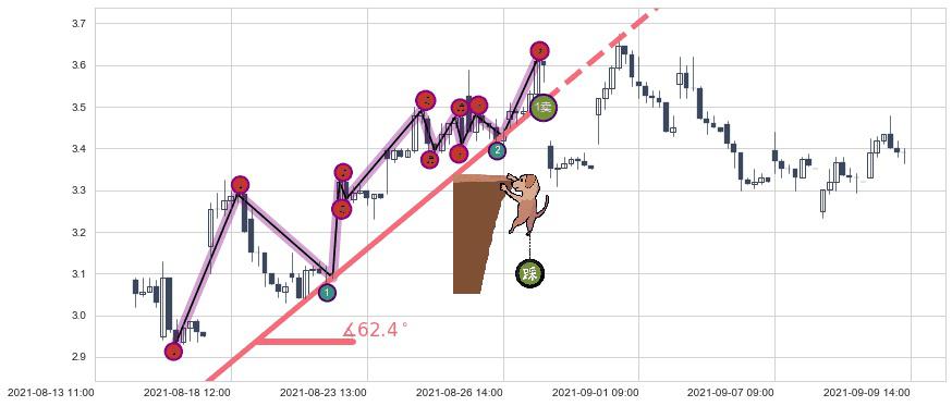 ➣ 2021-08-17 11:00-2021-08-27 14:00上升趋势存在反转[风险],其原上升趋势的支撑位(4.23)已破位[强阻力信号],原上升趋势角度: 62.4˚