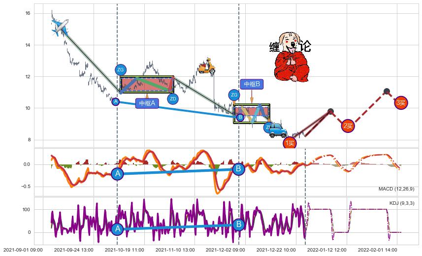 ➣ 缠论买卖点:下降缠中枢AB形成后猜想拐点1买已到达,猜想后续持续拉升(均值回复)