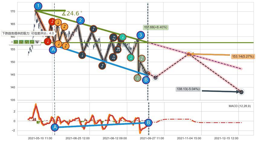 ♘ 在最后的下跌阶段2021-04-19 13:00至2021-09-09 14:00,存在 持续未破位的阻力位 ,阻力价格157.68,可信任强度83.97%,其距离最后价格145.47相差 +8.40%