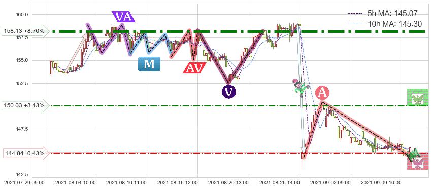 ♘ 阻力价格位150.03,可信任强度48.74%,距离最后交易2021-09-09 14:00形成的收盘价格145.47相差 +3.13%