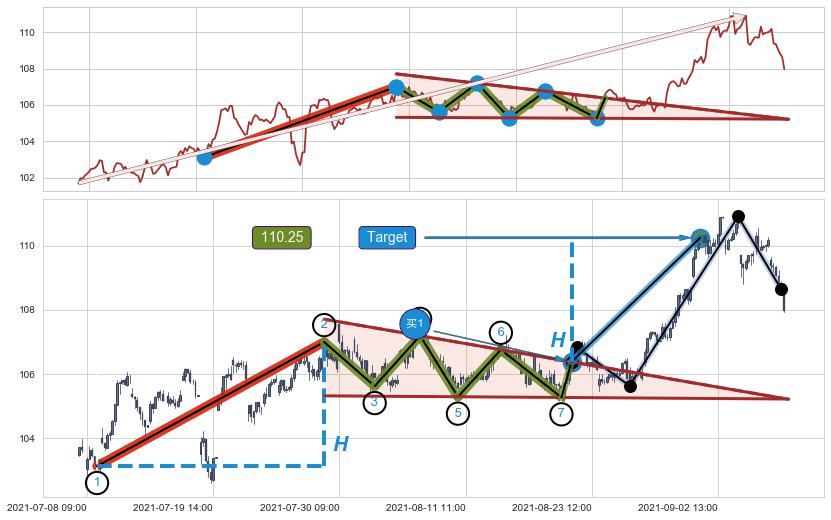 ➣ 【支撑】多方的买盘使低点支撑位【③⑤⑦】逐步抬高 构成三角的倾斜上涨支撑斜边