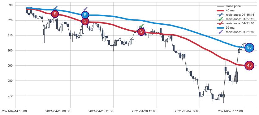 ➢ 最优均线组合共正确确认支撑阻力信号11处,正确确认率 78.57%