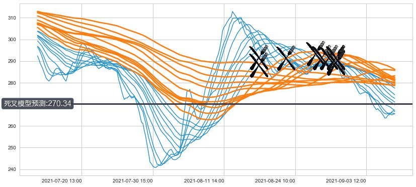 ➣ 70小时均线于(08-23 09:00: 291.17)形成【死叉】基于【死叉历史模型】预测死叉后最低波谷价格: 266.36, 死叉后最低价格263.19,已经下跌超出预测最低波谷价格, 预期反弹